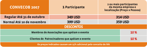 A Organização estipulou um valor especial às primeiras 300 inscrições para o 1º Congresso Mundial de Crédito e Cobranças. Para isso, seguirá uma ordem rigorosa de pré-inscrições. As inscrições estão abertas desde o primeiro dia do mês de Março de 2007. Mais informações sobre o evento podem ser obtidas pelo seguinte correio eletrônico: