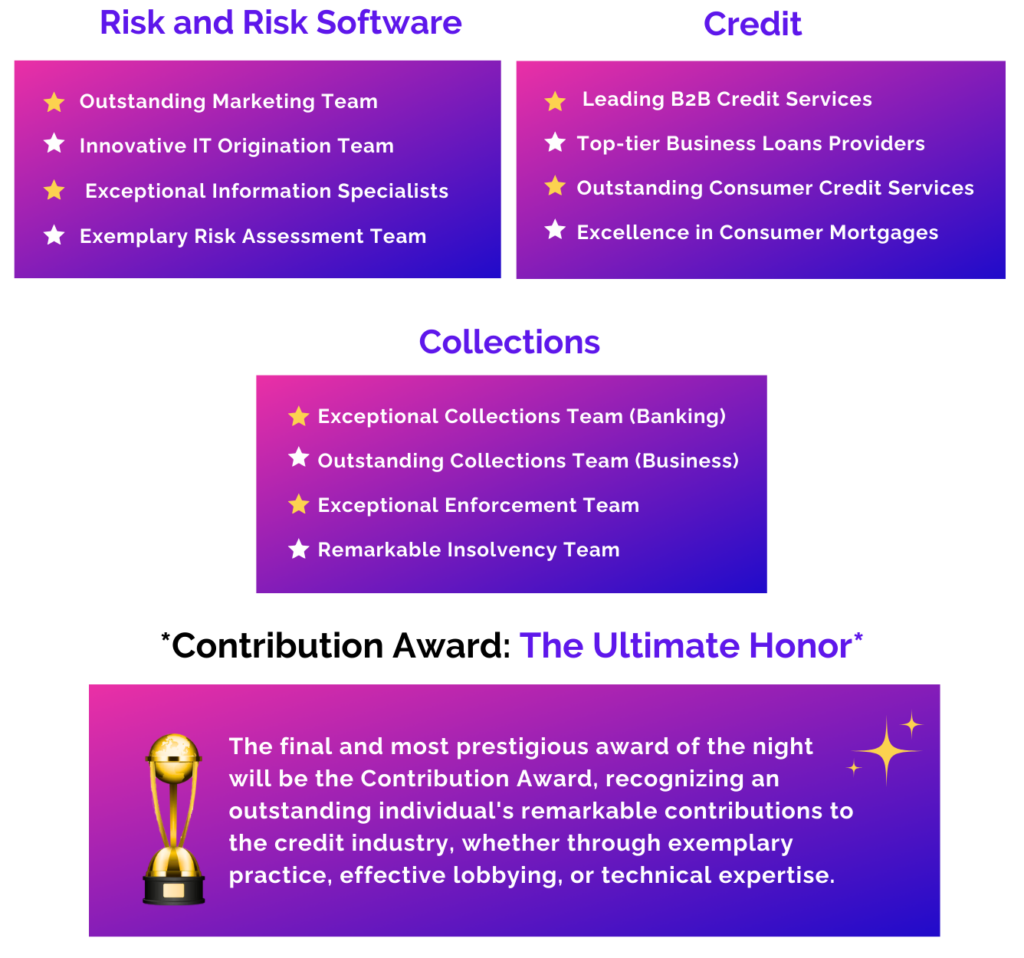 The Global Credit Awards feature a diverse range of categories, carefully curated to encompass the multifaceted nature of credit management. From outstanding risk management practices to pioneering technological solutions, these awards recognize excellence in areas such as: