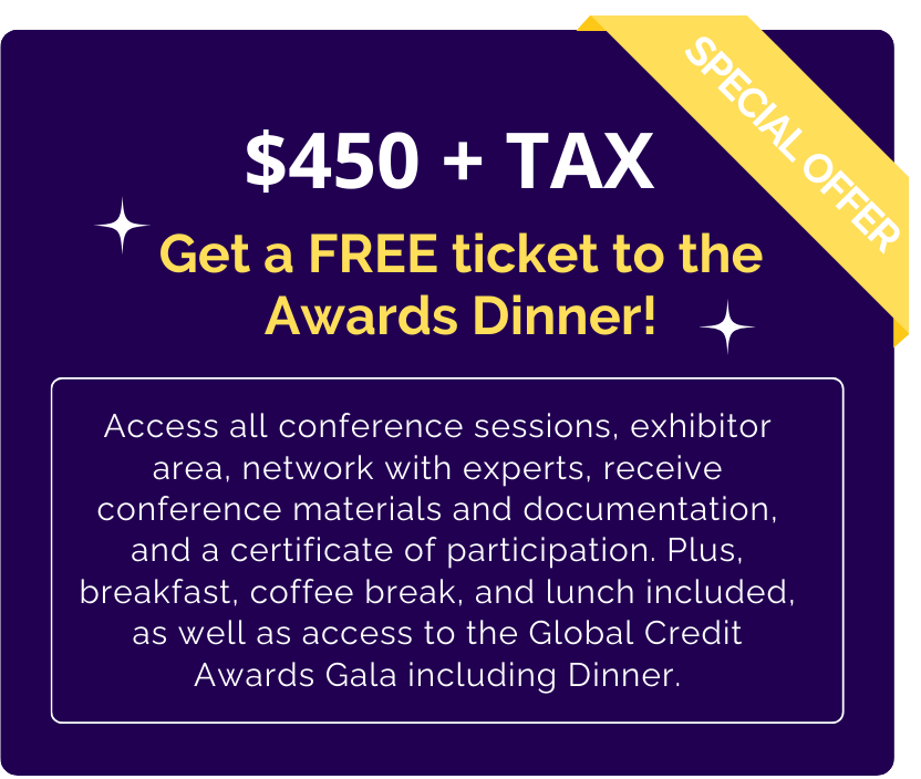 In addition to access to all conference sessions and exhibition areas, your ticket price includes 3 breakfasts, 2 lunches and (for a limited time) entrance to the Global Credit Awards including Dinner.